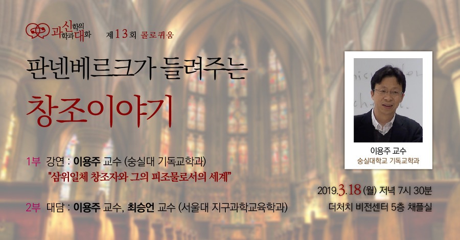 2019년 첫 콜로퀴움은 20세기 대표적인 신학자로 손꼽히는 볼프하르트 판넨베르트의 창조론을 소개받는 강의로 준비했습니다. 판넨베르크는 현대 자연과학이 제시하는 대부분의 법칙과 원리들, 곧 진화론, 열역학 제2법칙, 인간원리, 상대성이론, 나아가 양자역학에 이르는 과학 이론을 전통적인 삼위일체 신학 안으로 통합합니다. 이용주 교수님으로부터 현대 자연과학의 중심 내용을 포괄할 수 있는 판넨베르크의 창조론을 들어 봅니다.