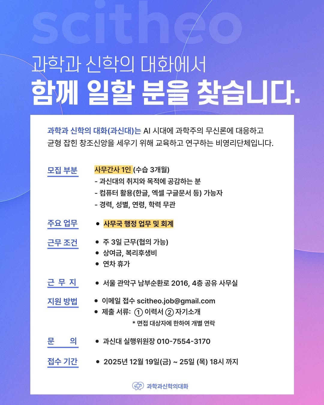 ◎ 지원 방법 : 이메일 접수 scitheo.job@gmail.com