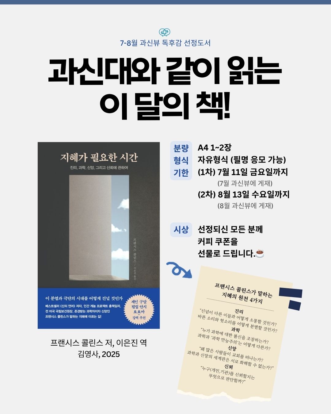 7, 8월 과신대 선정도서는 김영사 근간 『지혜가 필요한 시간』입니다. 아주 유익한 독서가 되실 거예요. 독후감을 보내주시면 커피 쿠폰을 선물로 보내드려요!