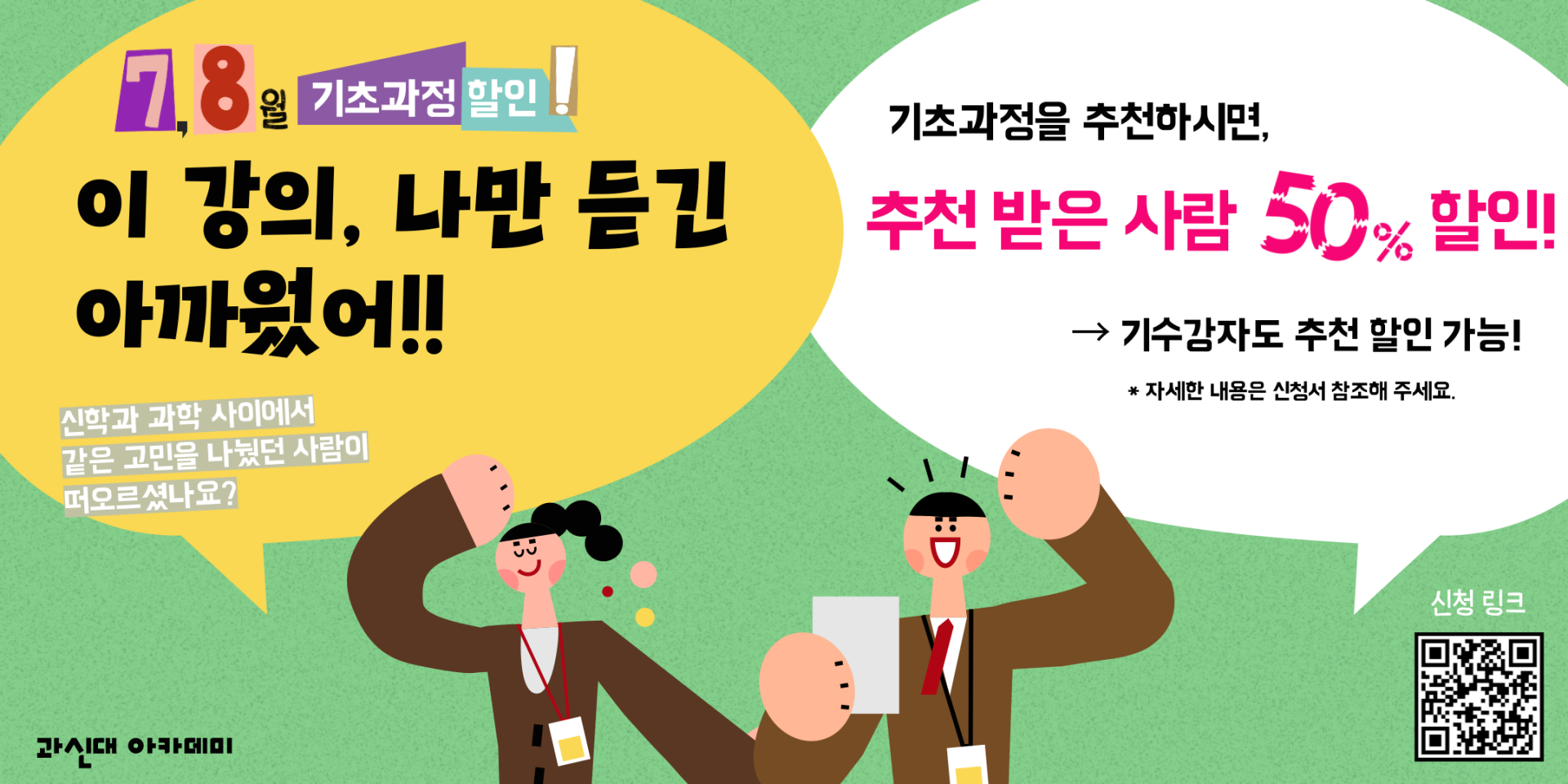 과신대 정회원이라면 기초과정을 모두 수강하셨을텐데요. 기초과정, 나만 듣기 아깝지 않으셨나요? 가족에게, 친구에게, 교우에게, 지인에게 추천하고 싶은데 적절한 기회를 못 잡고 있었다면, 바로 지금이 추천하기 딱 좋은 타이밍입니다! 기초과정을 추천해 주시면, 추천 받은 사람에게 수강료를 할인해 드리는 이벤트를 열었어요. 이번 기회에 기초과정을 널리 추천해 주세요! 😍