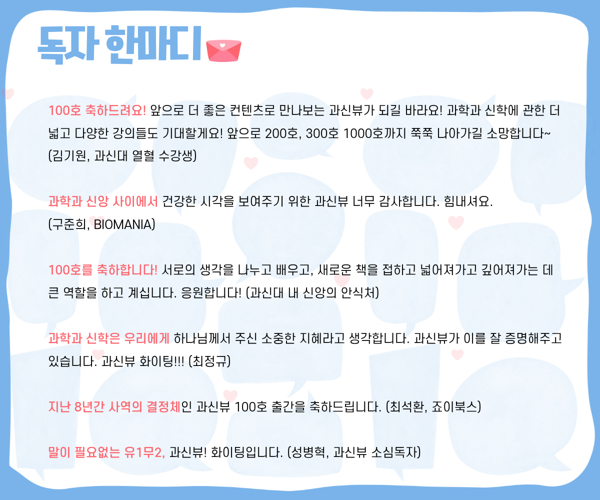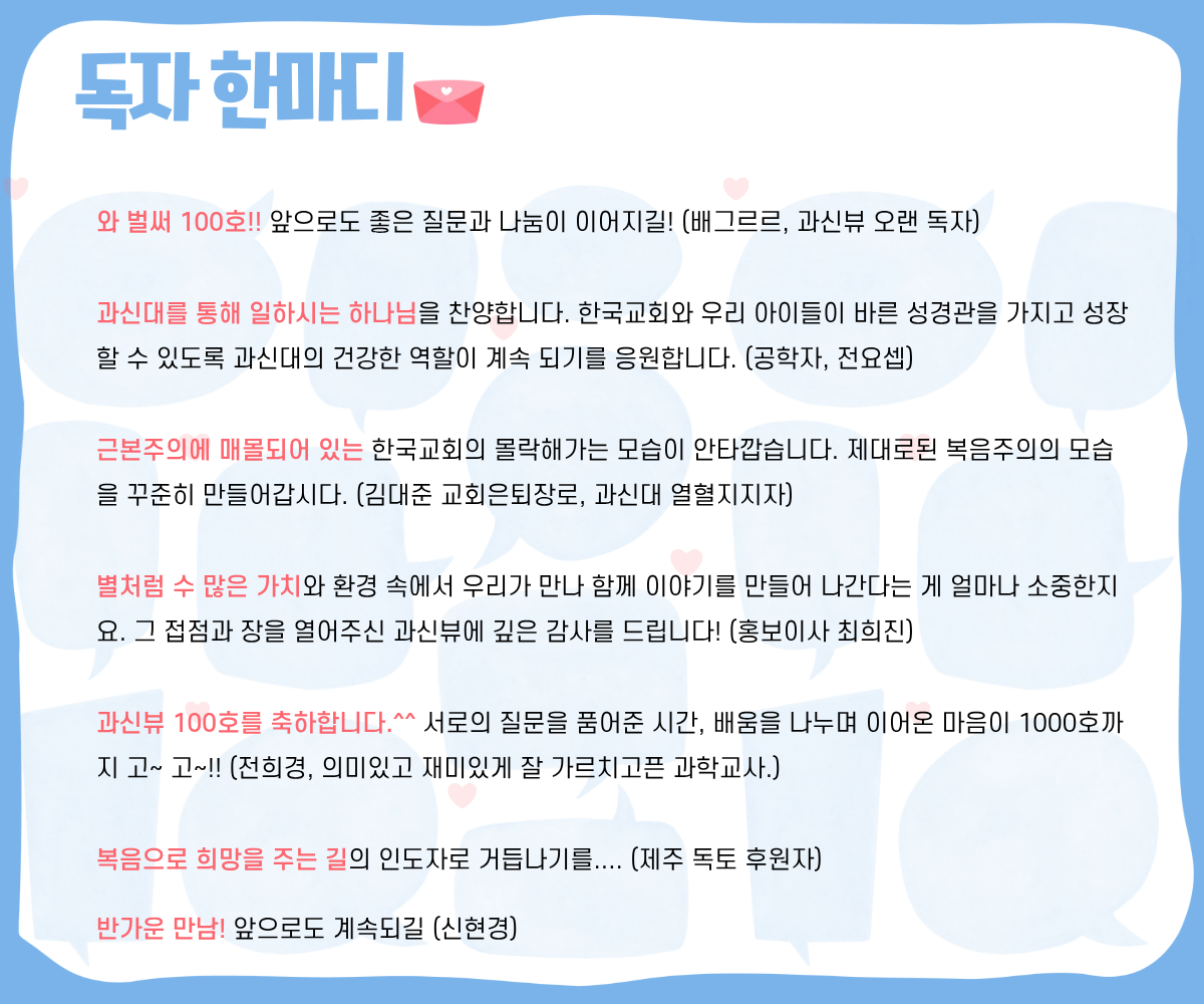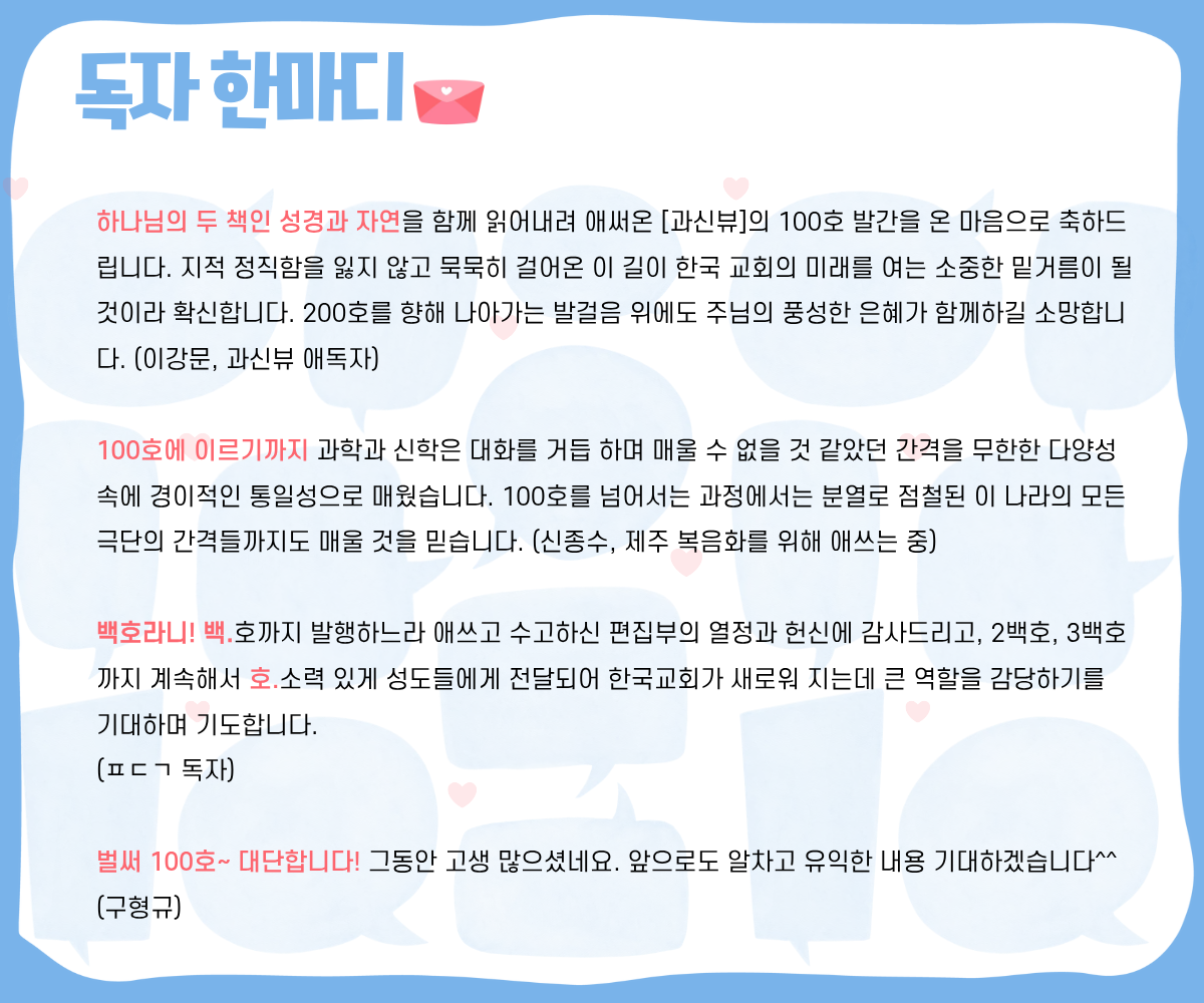 하나님의 두 책인 성경과 자연을 함께 읽어내려 애써온 [과신뷰]의 100호 발간을 온 마음으로 축하드립니다. 지적 정직함을 잃지 않고 묵묵히 걸어온 이 길이 한국 교회의 미래를 여는 소중한 밑거름이 될 것이라 확신합니다. 200호를 향해 나아가는 발걸음 위에도 주님의 풍성한 은혜가 함께하길 소망합니다. (이강문, 과신뷰 애독자)