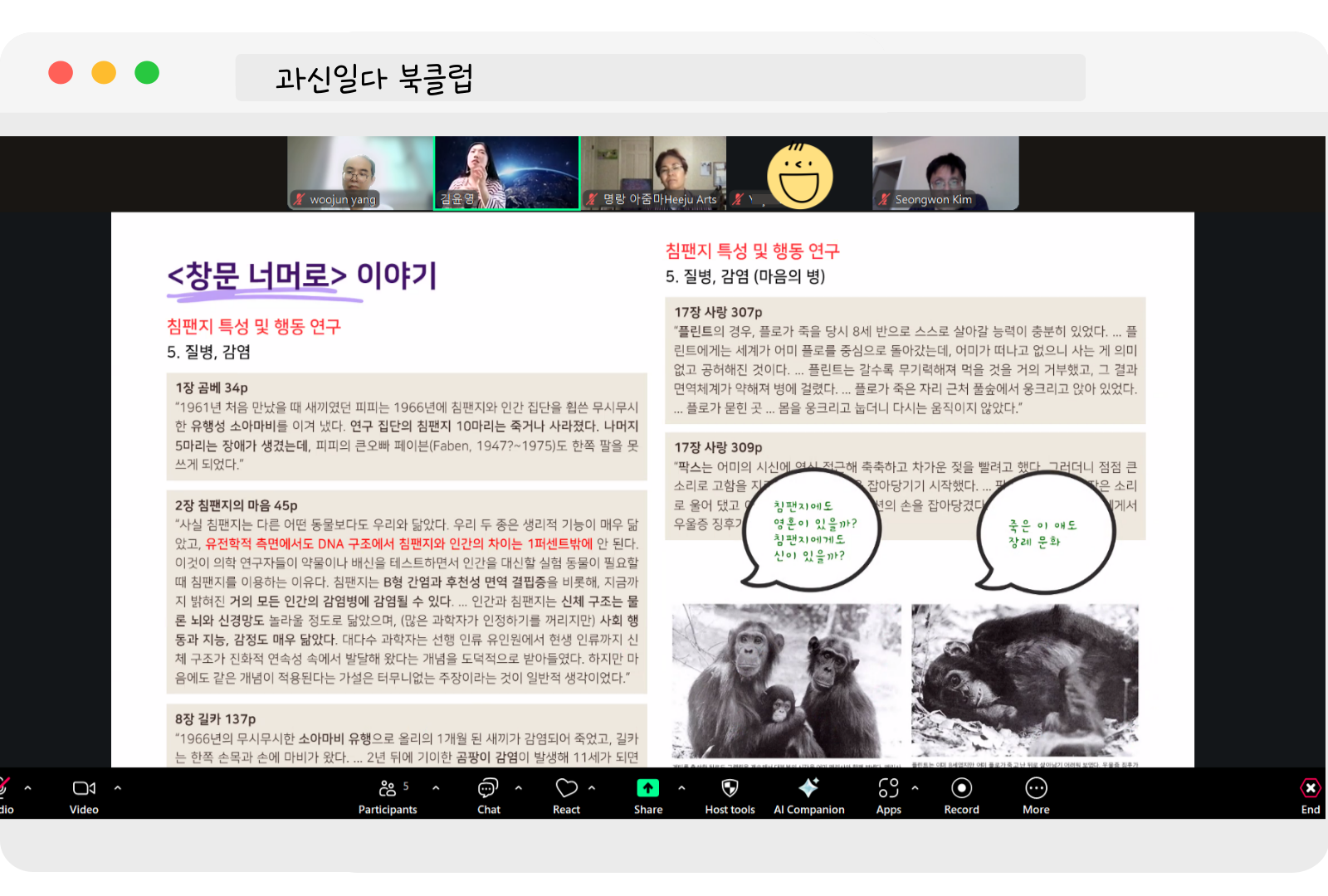 책은 인간 중심적 사고에 대한 새로운 통찰을 요구한다. 현재 가지고 있는 사고의 틀 안에 창문을 만들어 이쪽의 공기와 저쪽의 공기가 섞일 수 있는 길을 제시한다. 곰베를 향해 제인 구달이 만들어 낸 새로운 창문은 우리들의 사고가 창문 밖으로 나가면 발상 자체가 뒤집어질 수도 있다는 전제를 인정해야 침팬지를 통해 또 다른 세계를 경험한다고 말한다. 제인 구달은 평생을 침팬지를 관찰하며 누적된 정보로 곰베로 향한 창문을 만들었다. 창문 밖에는 인간이 알 수 없는 침팬지의 언어가 있었고 그들의 사회 질서와 감정이 있었다. 권력과 전쟁 그리고 짝짓기 등에 대한 많은 대화가 이어졌다. 그들과 가까이에서 오래 섞여야 침팬지의 생태를 알 수 있다는 부분에서는 기독교 선교의 방법도 이와 비슷한 맥락의 방법이라야 하지 않겠는가 하는 의견을 여러 단기 선교의 폐해를 상기하며 조심스럽게 나누었다.