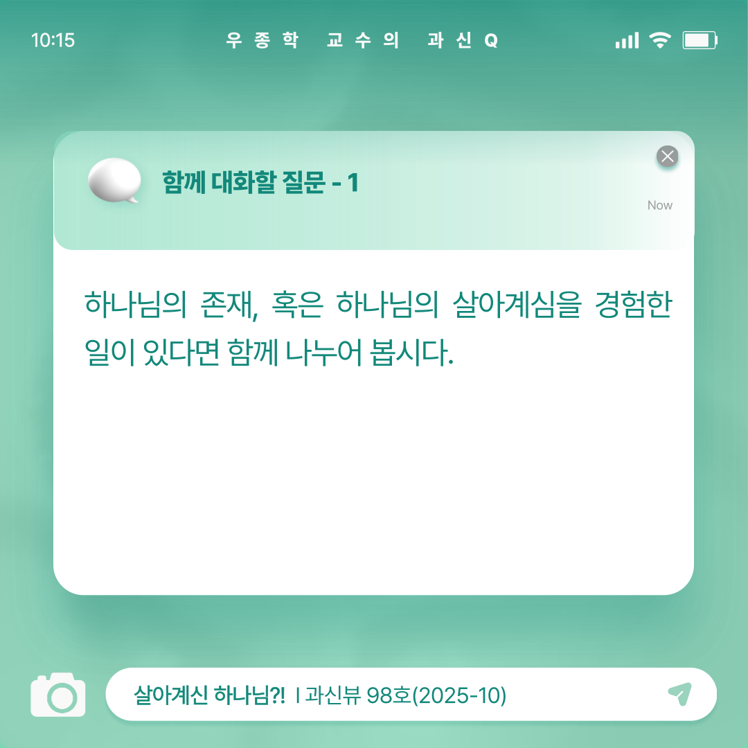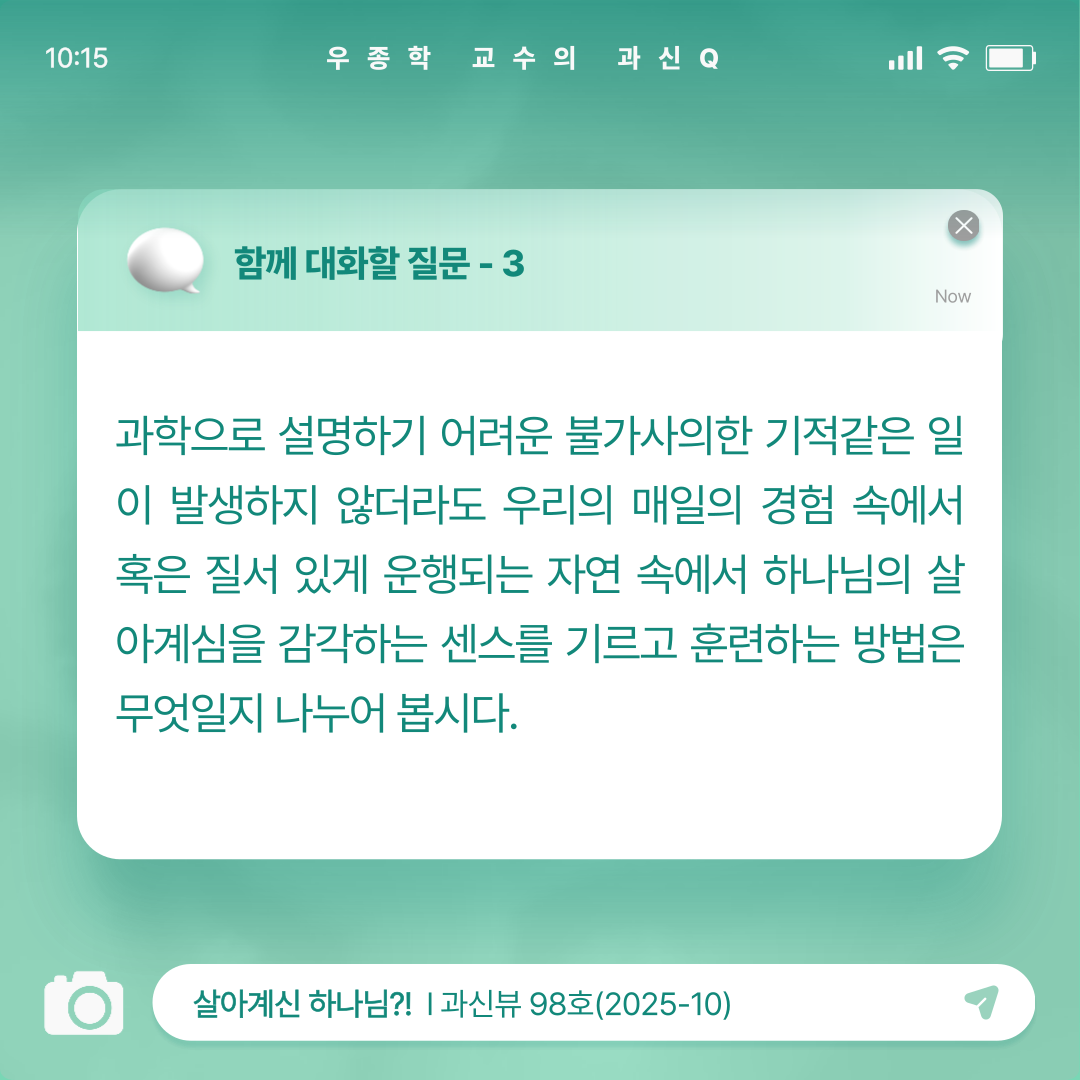 3. 과학으로 설명하기 어려운 불가사의한 기적 같은 일이 발생하지 않더라도 우리의 매일의 경험 속에서 혹은 질서 있게 운행되는 자연 속에서 하나님의 살아계심을 감각하는 센스를 기르고 훈련하는 방법은 무엇일지 나누어 봅시다.