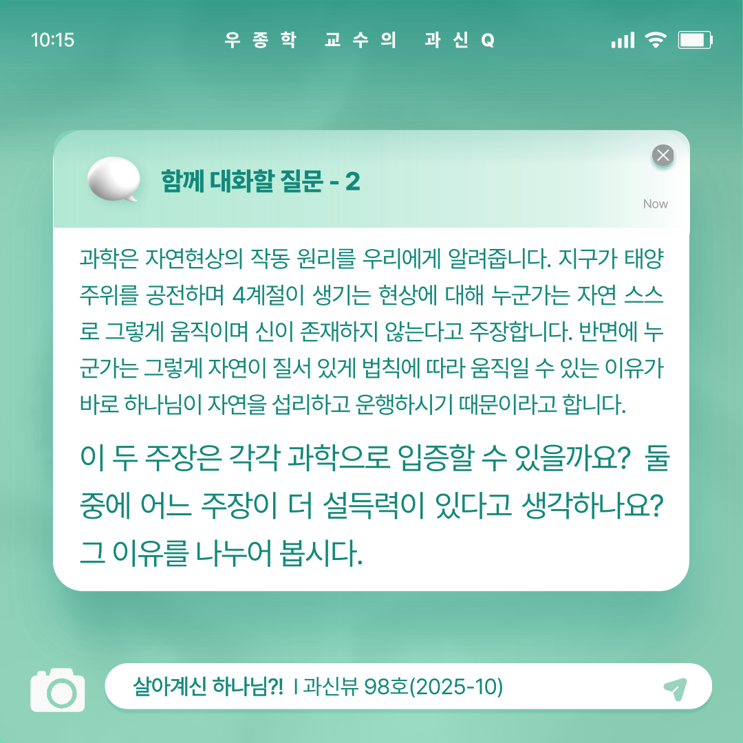 2. 과학은 자연현상의 작동 원리를 우리에게 알려줍니다. 지구가 태양 주위를 공전하며 4계절이 생기는 현상에 대해 누군가는 자연 스스로 그렇게 움직이며 신이 존재하지 않는다고 주장합니다. 반면에 누군가는 그렇게 자연이 질서 있게 법칙에 따라 움직일 수 있는 이유가 바로 하나님이 자연을 섭리하고 운행하시기 때문이라고 합니다. 이 두 주장은 각각 과학으로 입증할 수 있을까요? 둘 중에 어느 주장이 더 설득력이 있다고 생각하나요? 그 이유를 나누어 봅시다.